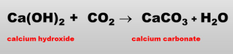 Carbonation of calcium hydroxide in cement paste from exposure to air.
